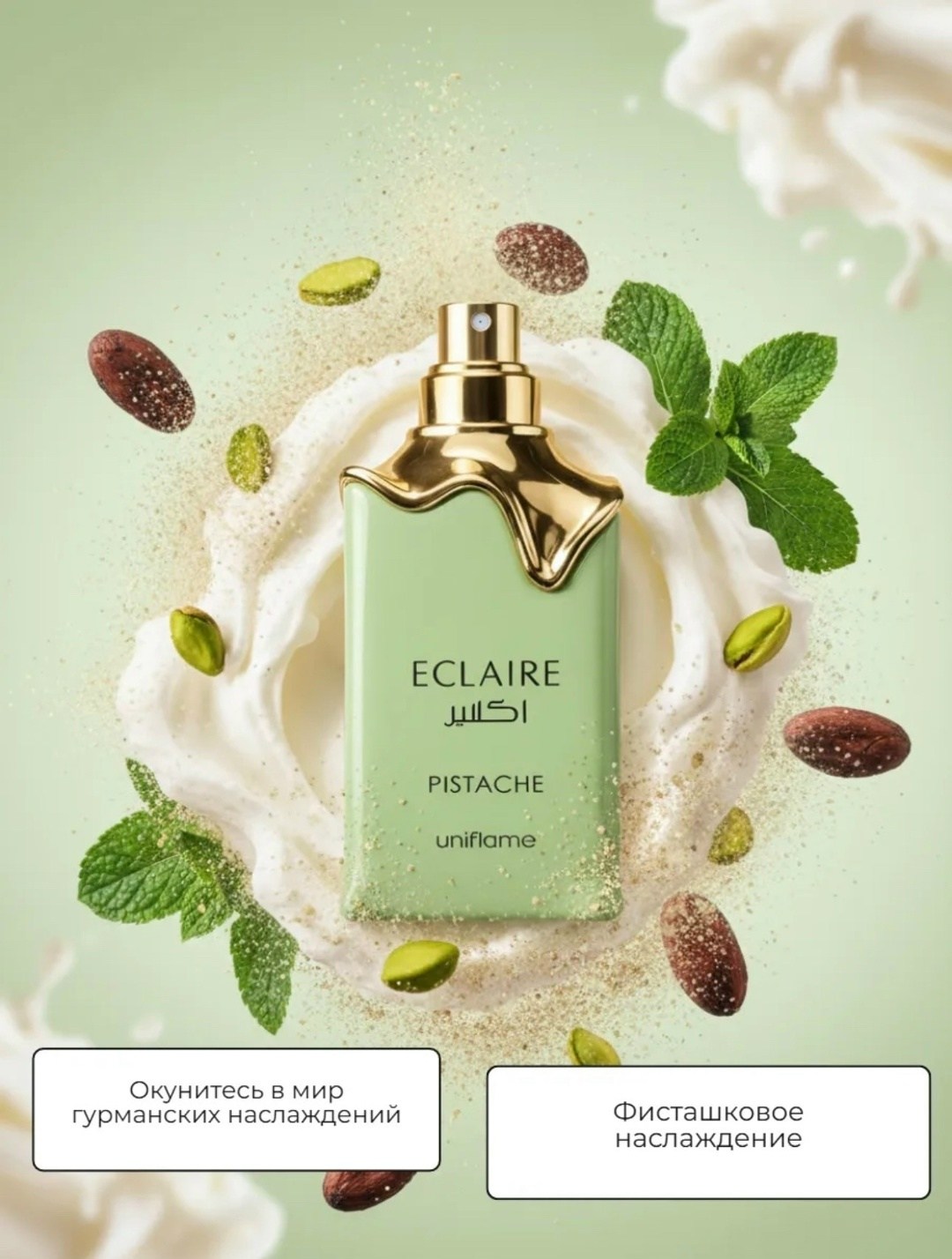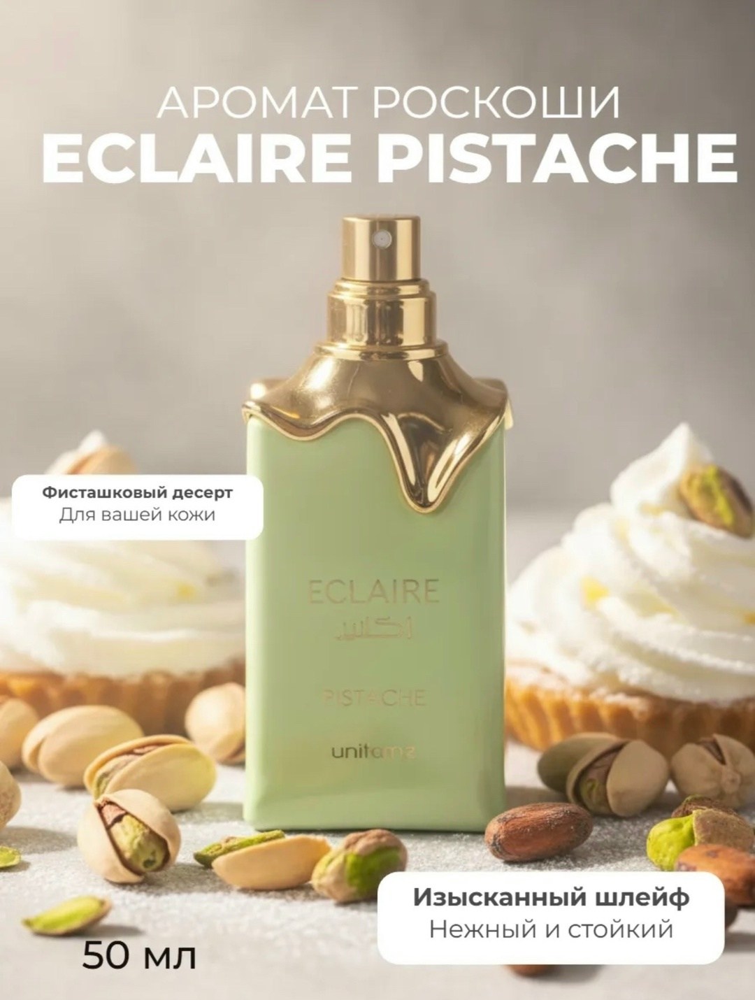 Lattafa eclaire pistache (2025) это гурманский унисекс-аромат, созданный как кремовый фисташковый десерт Композиция открывается нотами фисташковой пасты и жареных орехов, переходя в сердце из какао и взбитых сливок База из ванили, молока и мускуса придает стойкость и уютный, сладкий шлейф.