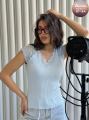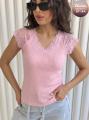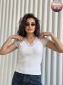 Майка-футболка с кружевным декором на коротких рукавах реглан и v-образном вырезе, где искусство элегантности воплощается женственностью в гармонии нежности и лаконичного дизайна.