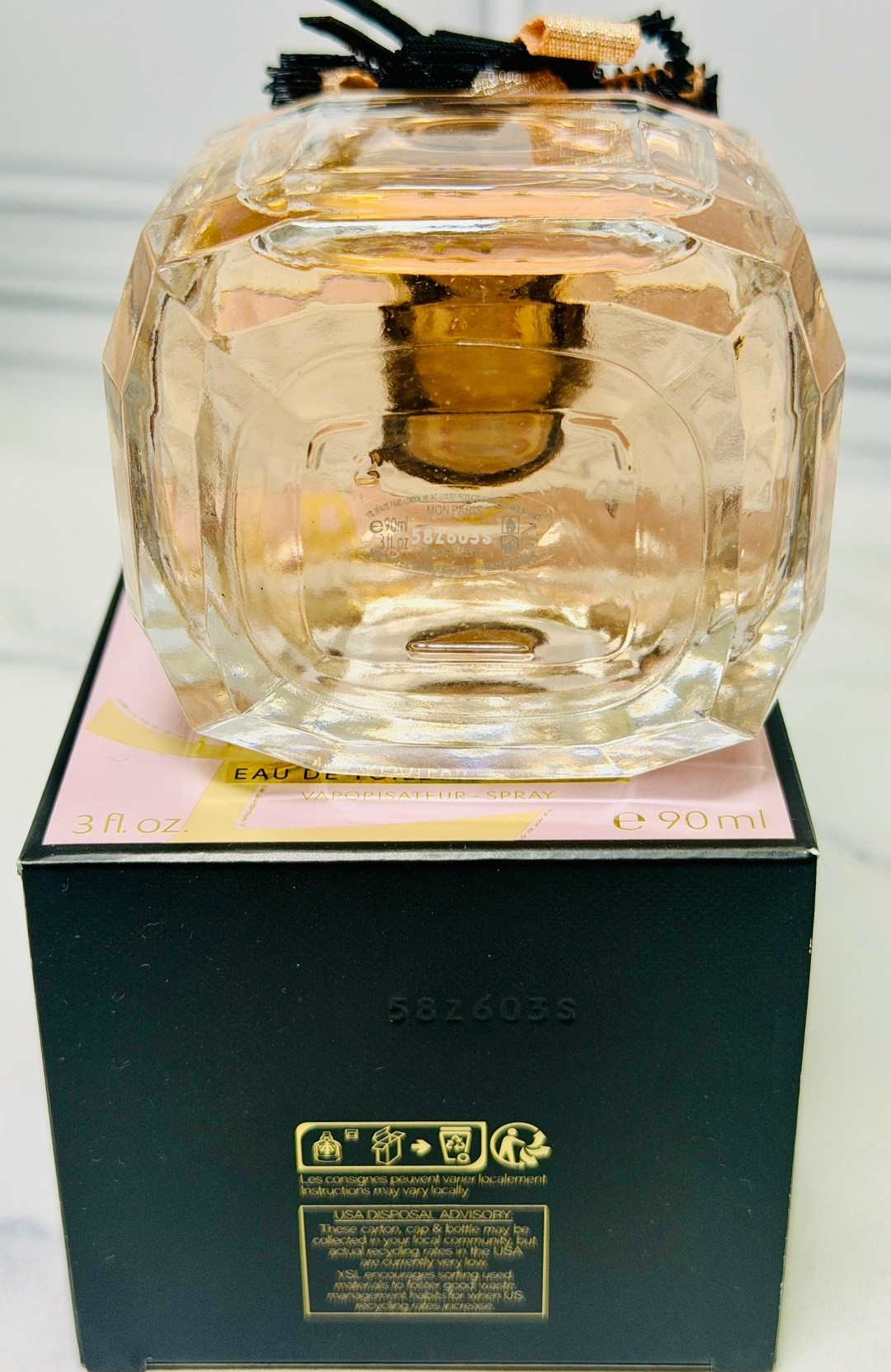 Флакон как наряд от кутюр: прозрачная лента из органзы (как те самые блузы сен-лорана), под которой угадывается атлас телесного цвета, и изящная подвеска с логотипом.