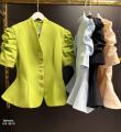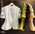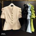 Дизайн с буфами на плечах добавляет оригинальности и делает внешний вид более выразительным, а аккуратная стойка придат завершнность и особый шарм.