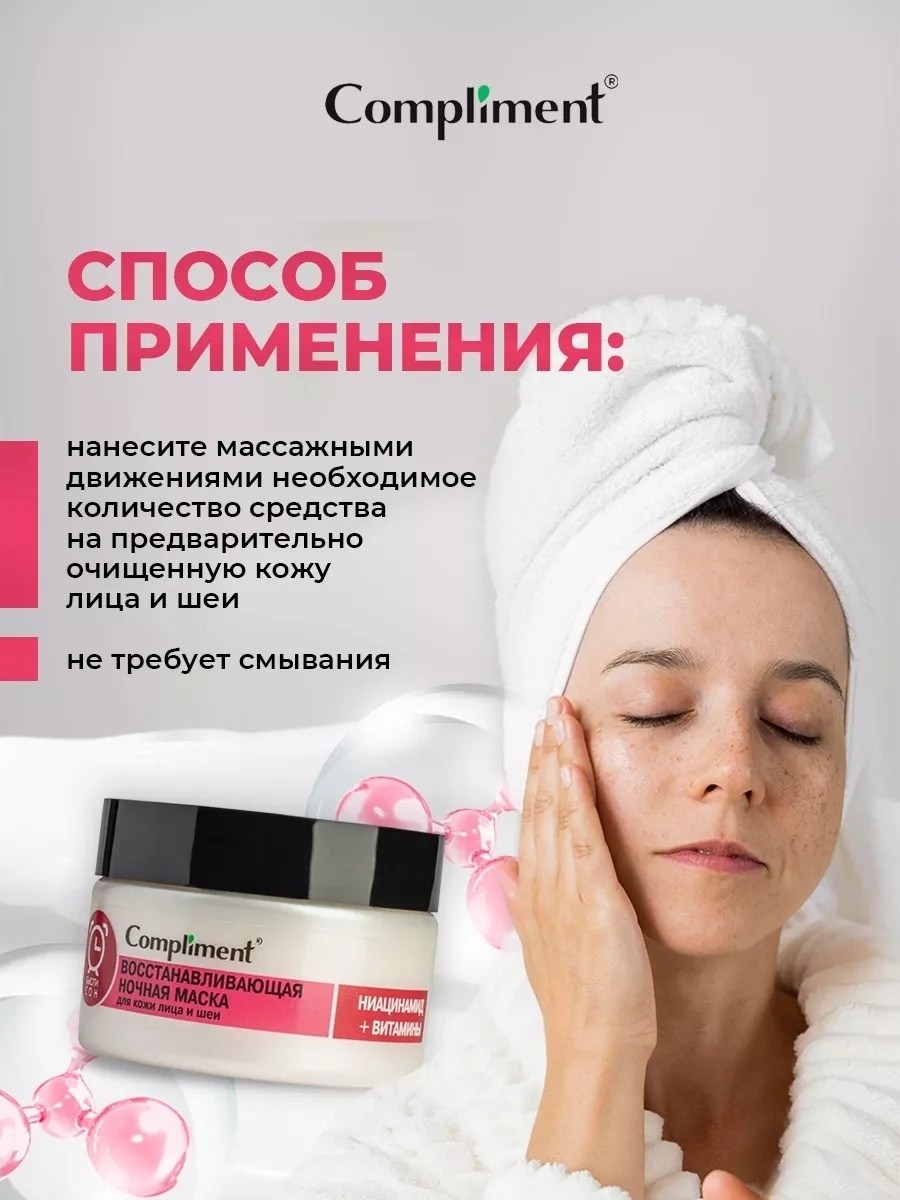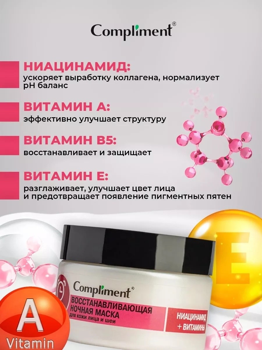 Ночная маска для лица комплимент для сохранения молодости и упругости кожи, великолепно питает, увлажняет, выравнивает цвет лица, а также восстанавливает барьерные функции кожи пока вы спите Ниацинамид является мощным регулятором клеточного обмена, ускоряет выработку коллагена, жирных кислот и керамидов, поддерживающих водный и жировой баланс кожи, выполняет функции антиоксиданта, минимизирует процессы внешнего негативного влияния Комплекс витаминов выравнивает тон, увлажняет и повышает эластичность кожи Витамин а эффективно улучшает ее структуру, витамин в5 активизируют процесс восстановления и защищает кожу от вредного воздействия окружающей среды Витамин е разглаживает, улучшает цвет лица и предотвращает появление пигментных пятен Способ применения: нанесите массажными движениями необходимое количество средства на предварительно очищенную кожу лица и шеи.