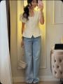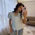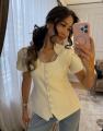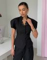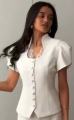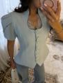 Приталенный женский жакет сибаской и коротким рукавом фонарик с вырезом на груди с гипюровыми вставками подчркивает фигуру придавая образу собранность и уверенность.