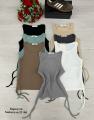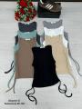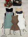 На фотографии представлены топы бренда sara различных цветов: черный, бежевый, светло-зеленый, коричневый и белый Каждый топ имеет завязки на спине, что позволяет регулировать посадку В верхней части изображения виден букет красных роз и кеды adidas коричневого цвета.