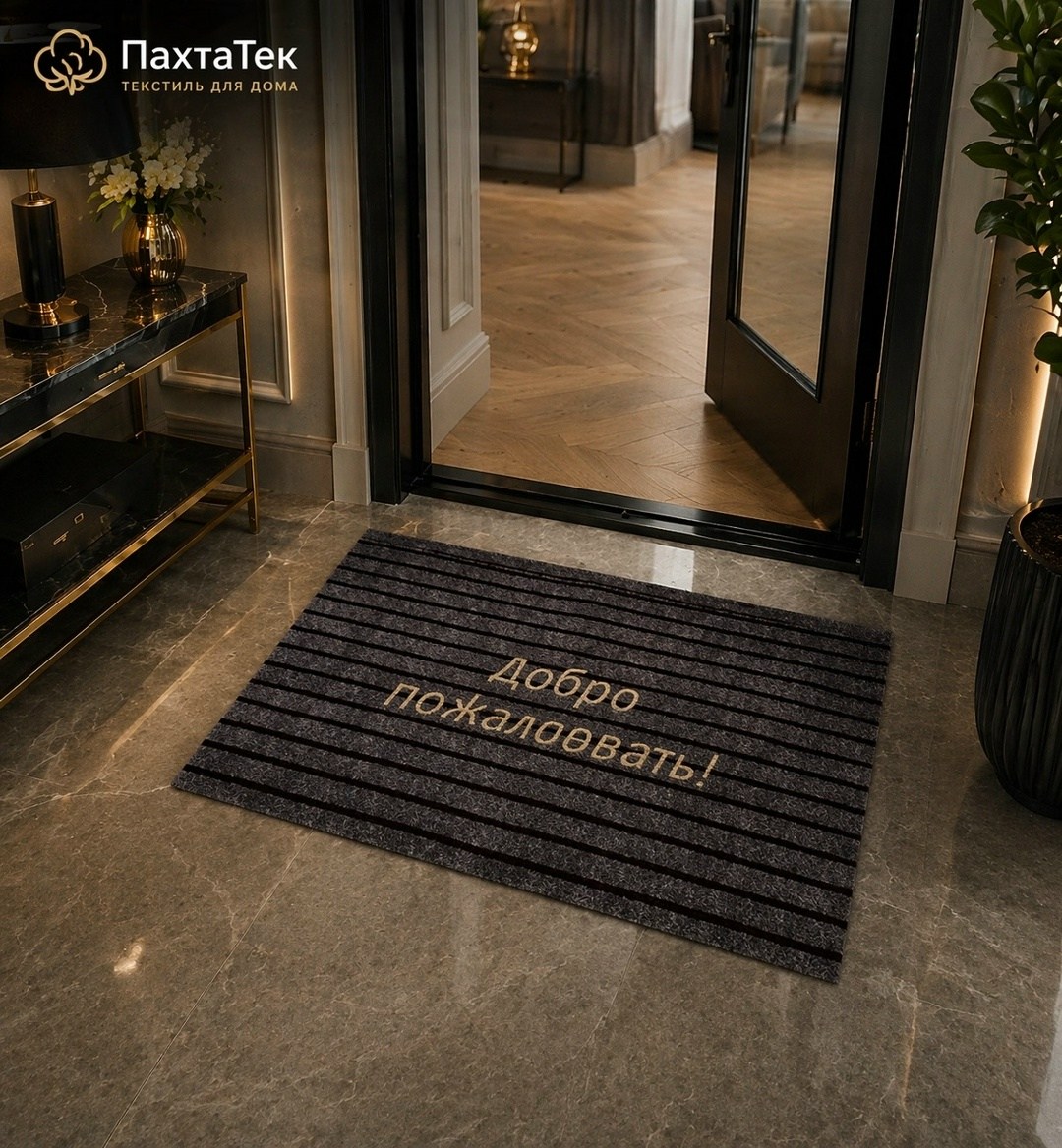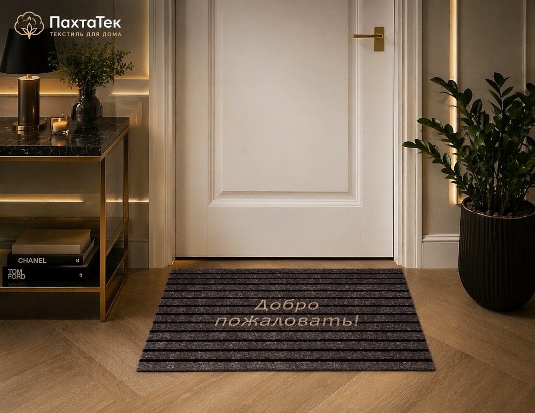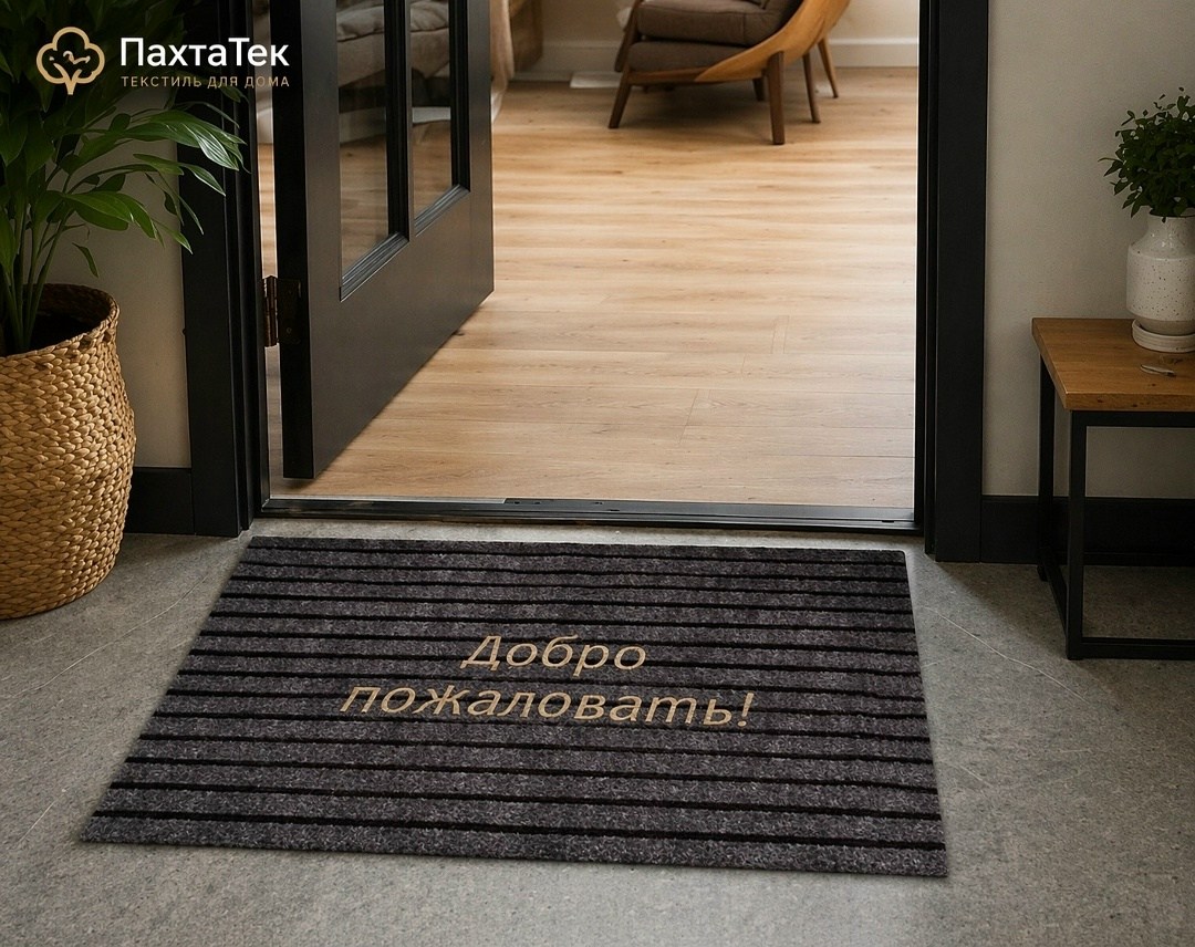 Стильный придверный коврик размером 6090 см станет практичным и красивым акцентом у входа в дом, квартиру или офис Современный дизайн в сдержанных темных оттенках с надписью добро пожаловать создает уютную атмосферу с первого взгляда.
