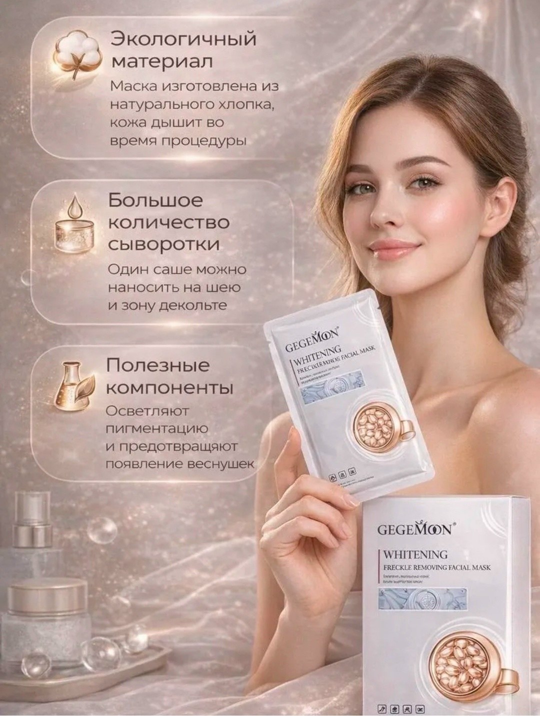 Тканьевая маска для лица gegemoon ваш экспресс-спа-салон дома Тканьевая основа прекрасно повторяет форму лица, обеспечивая максимальное воздействие активных ингредиентов Натуральные экстракты и витамины увлажняют, питают и оздоравливают кожу Результат заметен уже после первого применения: кожа выглядит свежей, подтянутой и сияющей Отличается доступной ценой и высоким качеством материалов Каждая минута, проведнная с маской gegemoon, приближает вас к совершенному внешнему виду и хорошему настроению Применение: наложите маску на чистую кожу лица на 1520 минут, снимите и осторожно вотрите оставшуюся жидкость Возьмите тайм-аут от суеты мира и посвятите время исключительно себе любимой.