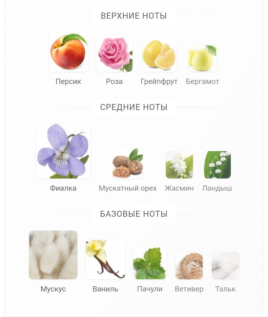 Средние ноты: фиалка, мускатный орех, жасмин и ландыш;.