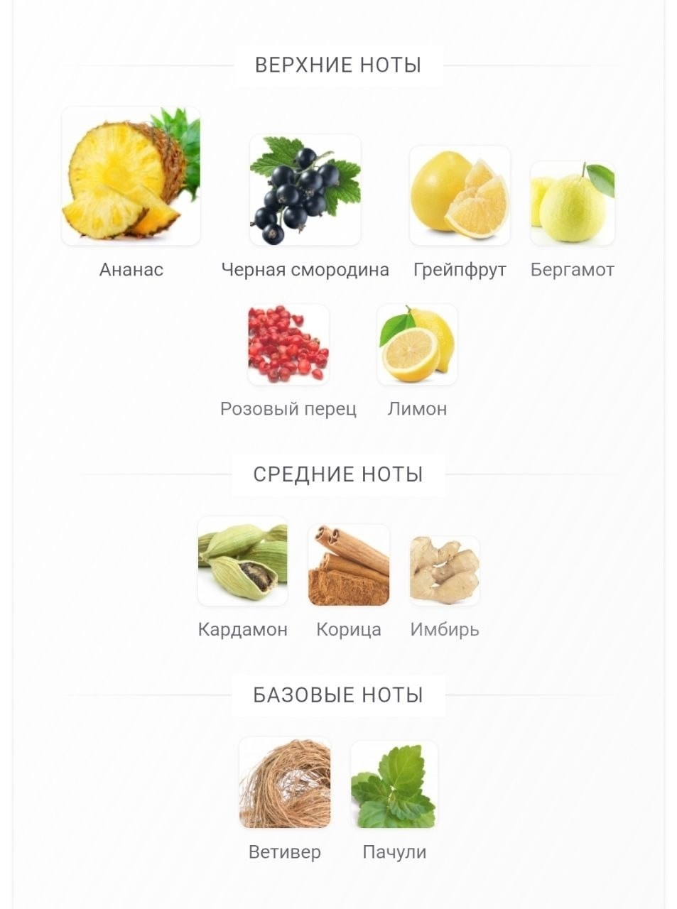 Верхние ноты: ананас, черная смородина, грейпфрут, бергамот, розовый перец и лимон;.