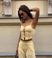 Нежная двойка, в которой вс про лгкость и женственность Топ на тонких бретелях с шнуровкой аккуратно подчркивает силуэт, создавая эффект утончнной талии, а свободные брюки добавляют образу расслабленности и комфорта Идеальный баланс между элегантностью и повседневным стилем для прогулок, встреч и тплых вечеров.