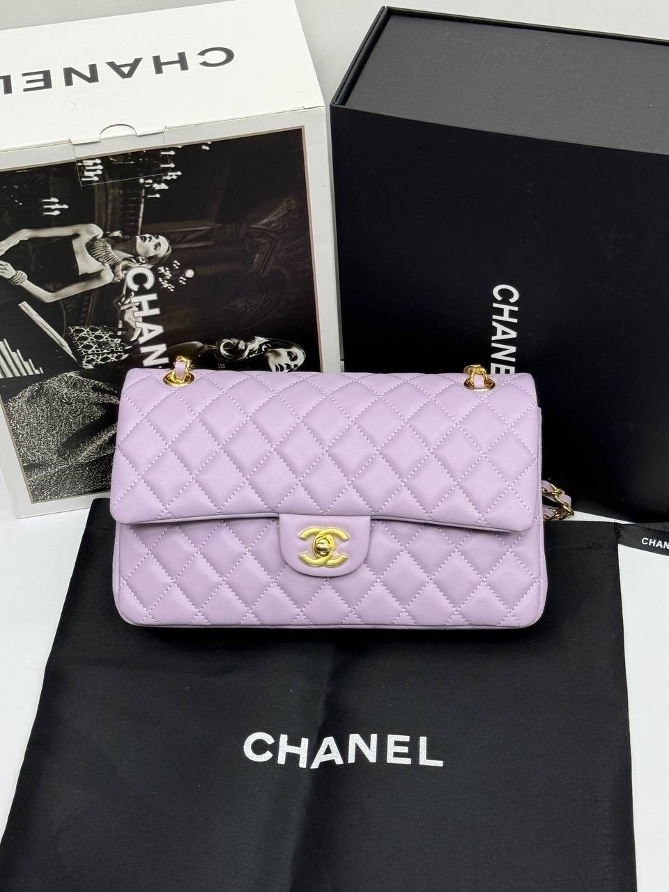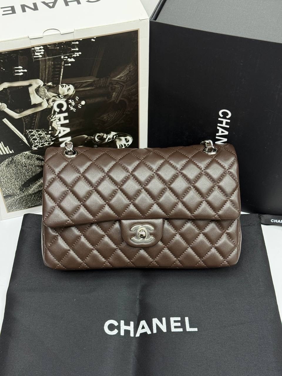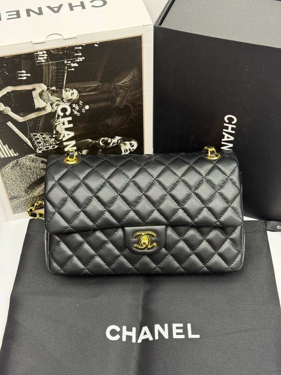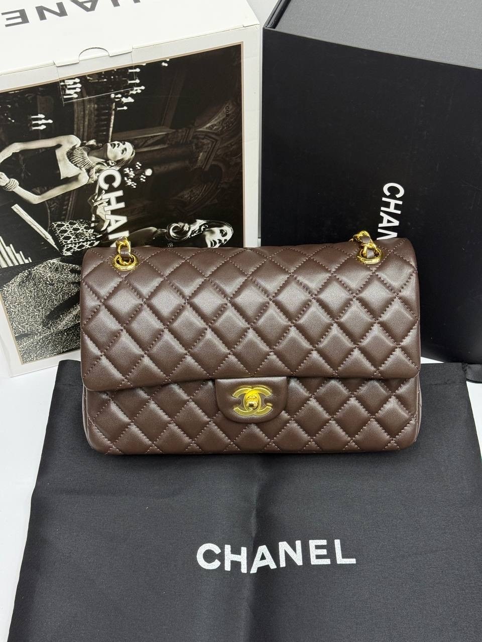В комплект фирменный и пыльник двойной коробка.