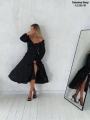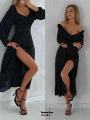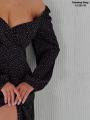 Элегантное платье миди в горошек, с вырезом на ноге и открытой областью плеч.