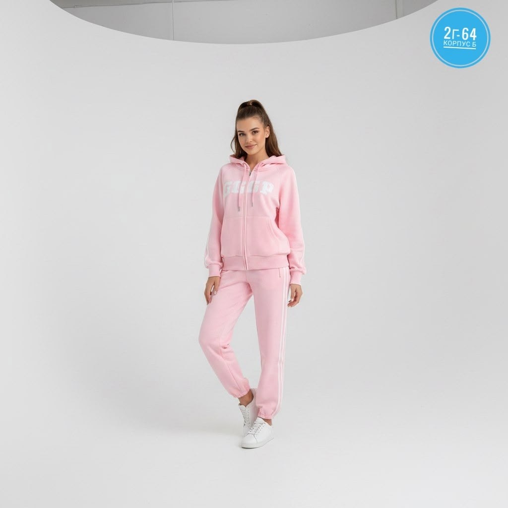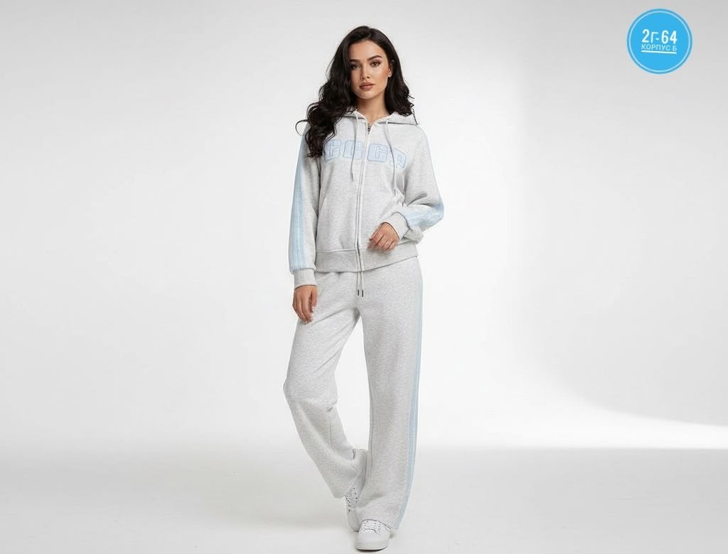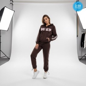 Модель выполнена в стиле оверсайз с широкими брючками с копюшона.