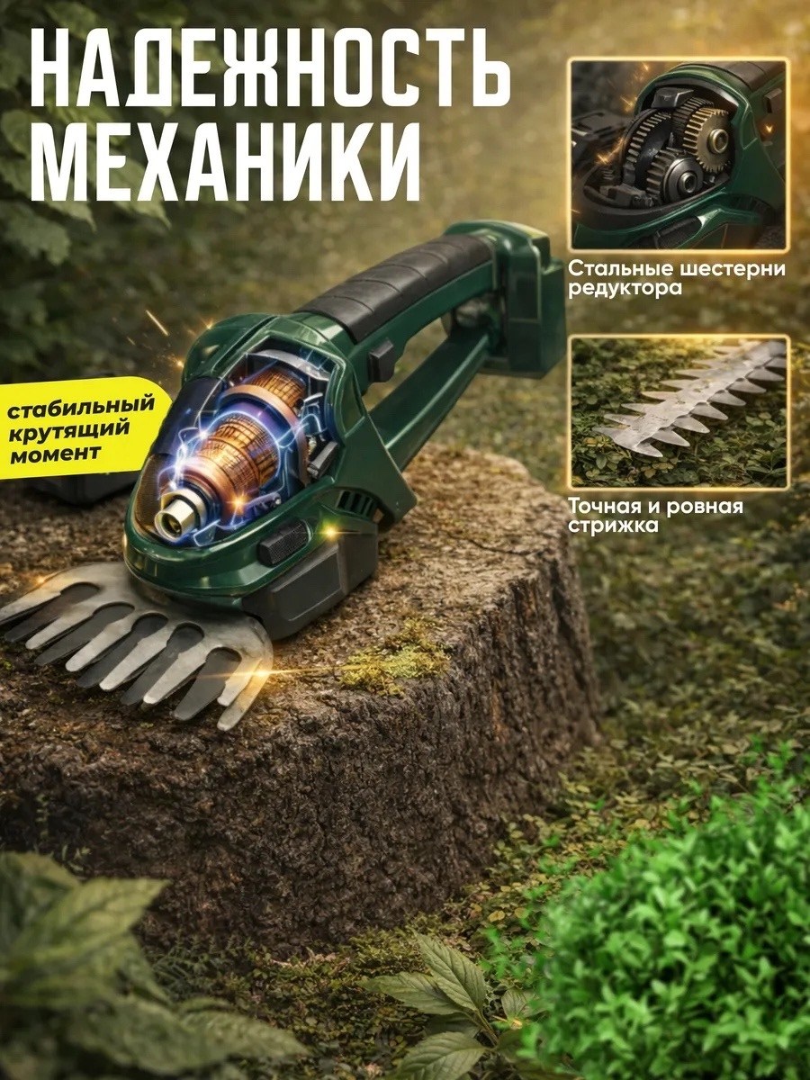 В комплект входят две насадки: насадка для кустов длиной 23 см, идеально подходящая для формирования и обрезки кустарников, и насадка для травы и фигурной стрижки длиной 13 см, которая позволяет создавать аккуратные и эстетически привлекательные формы.