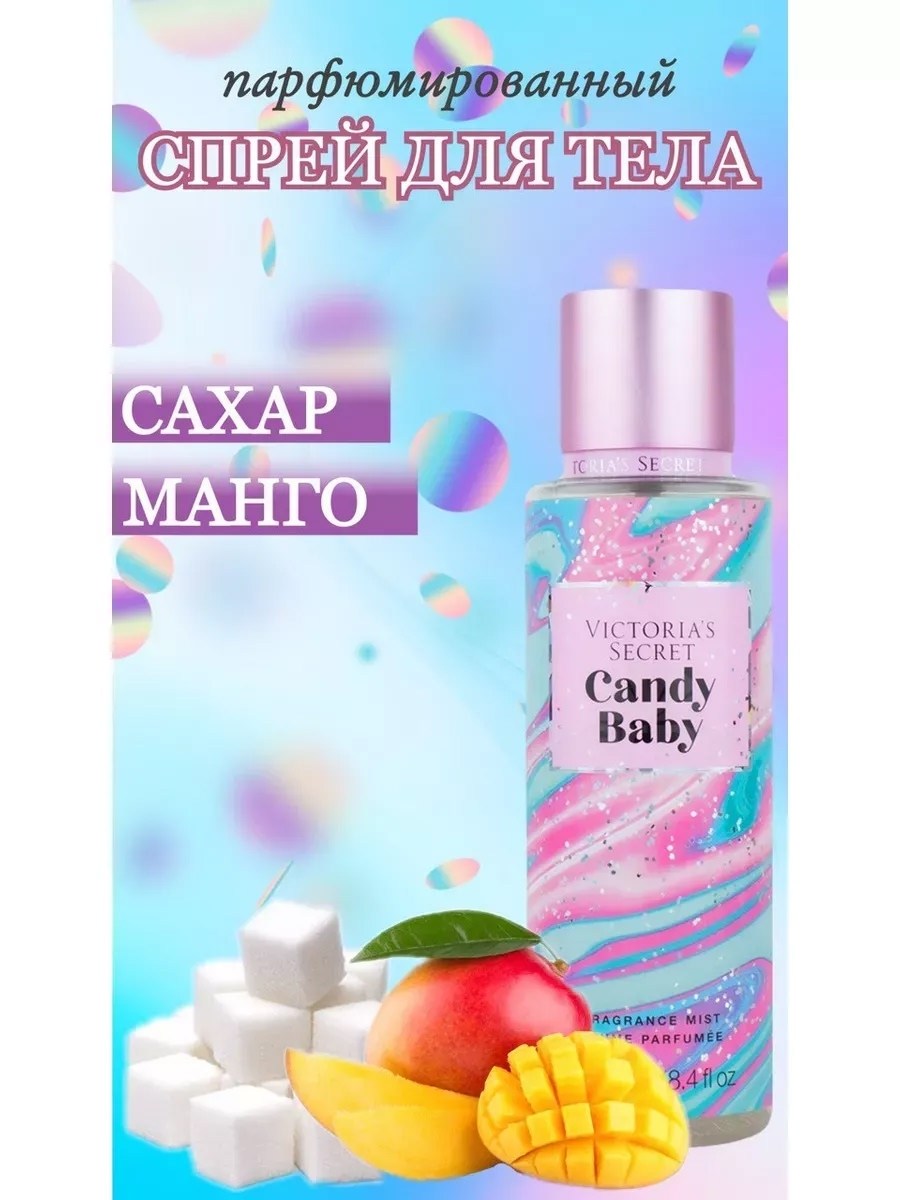 Victorias secret candy baby mist - это парфюмированный спрей для тела, у которого композиция в одно мгновение обволакивает тело нежным, легким, свежим благоуханием, которое будет сопровождать вас на протяжении всего дня Не содержит спирта, основывается на сочетании экстрактов ромашки и алоэ вера Имеет особый состав, он оказывает освежающее, успокаивающее, увлажняющее действие для прекрасного ухода за кожей Тип аромата: тплый, фруктовый Аромат: манго с блестящим сахарным вихрем Сладкий но не приторный, стойкий аромат поднимет настроение и неоставит равнодушным никого.
