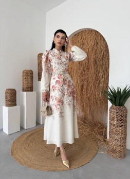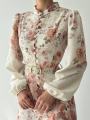 Элегантное платье миди в винтажном стиле Платье приталенного силуэта с нежным цветочным принтом Модель выполнена из приятной тканьи в благородном оттенке айвори Воротник-стойка, изящные пуговицы и объемные рукава на манжетах.