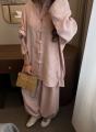Льняной костюм в корейском стиле свободная рубашка с акцентными застежками и брюки алладин расслабленный силуэт и стильный минимализм.